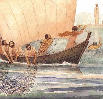 Petr a jeho přátelé se vrátili ke své rybářské práci. Jednou tvrdě pracovali celou noc, ale nic neulovili. Když už se rozednívalo a oni veslovali směrem ke břehu, uviděli na pláži muže, který jim řekl, aby znovu hodili sítě do moře. Apoštolové poslechli - a ulovili tolik ryb, že jim téměř potrhaly sítě.
