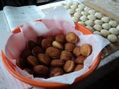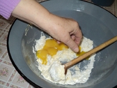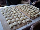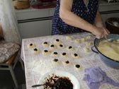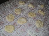 Kousky těsta roztahujeme prsty stejnoměrně do všech stran a doprostřed klademe povidla. (Asi malou lžičku povidel). Povidla s těstem uzavřeme a tím se vytvoří malé kuličky.