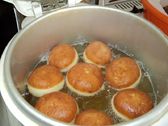 Do velkého kastrolu nebo vysoké pánve (nebo fritovacího hrnce) nalijeme 1,5 litru oleje, zahřejeme na 170 stupňů a do rozehřátého oleje opatrně vkládáme vykynuté koblihy. Smažíme 3 minuty z každé strany tak, aby byla kobliha do půlky ponořená do oleje, zašpičatělou špejlí obracíme po 3 minutách a smažíme po druhé straně. Hotové koblihy opatrně vyndáváme do mísy, kterou jsme předem vyložili ubrousky pro odsátí přebytečného tuku.